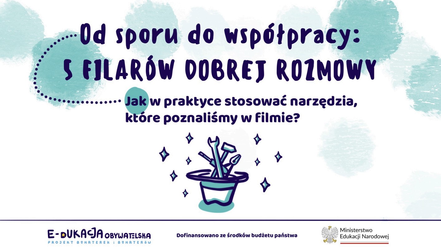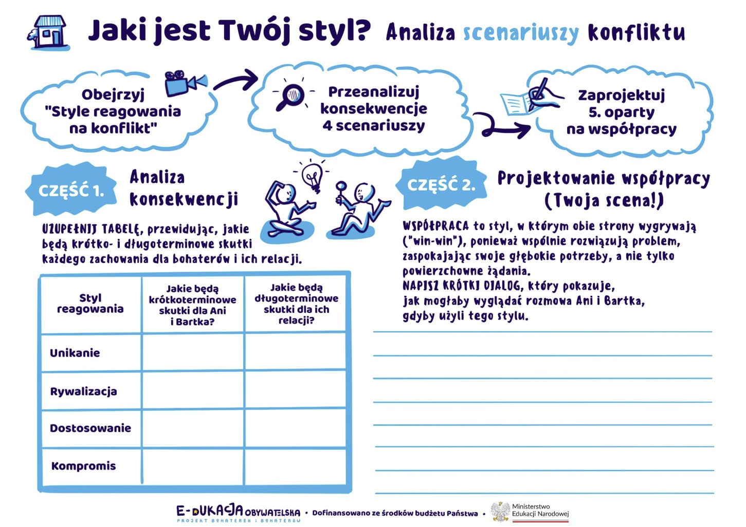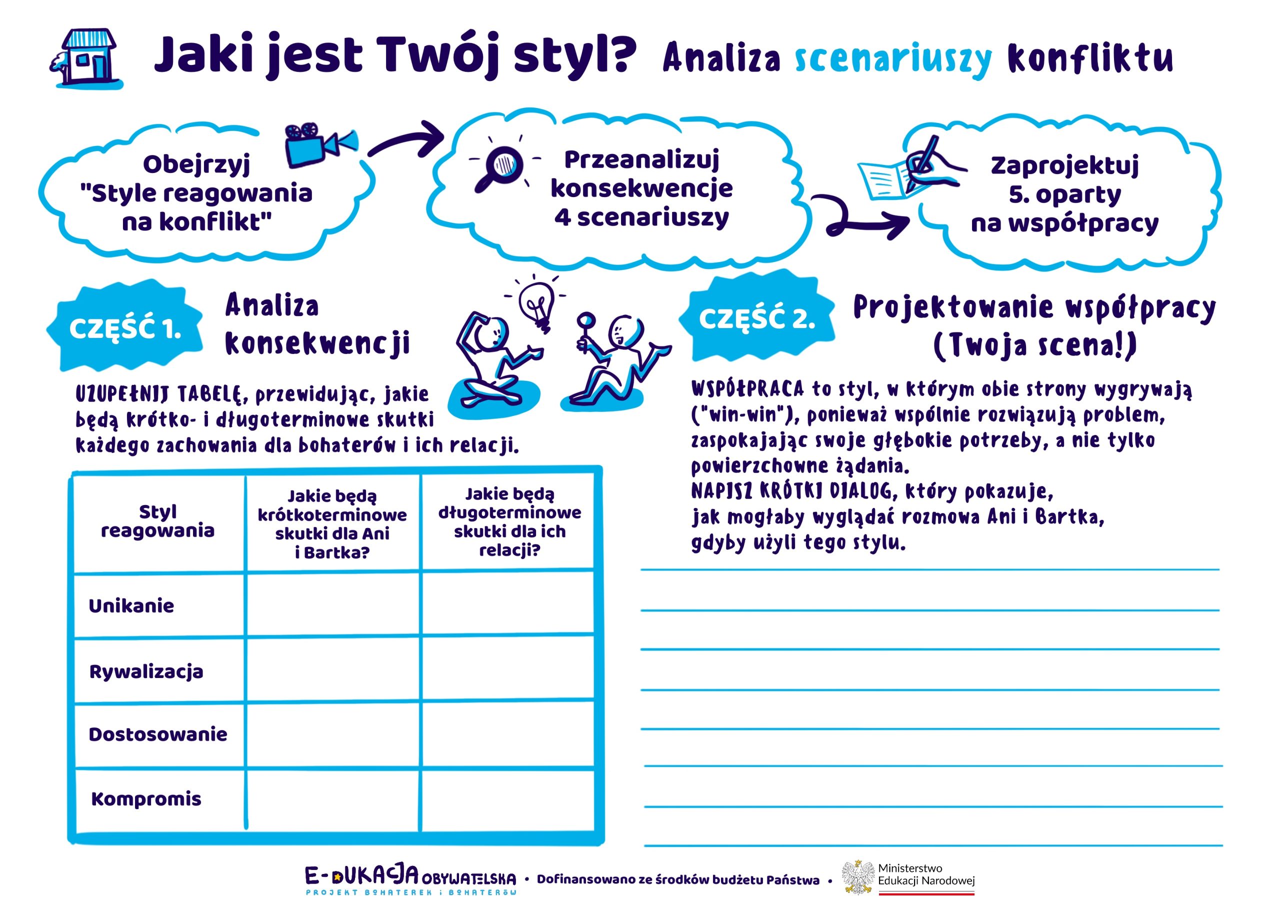Analiza Alternatywnych Zakończeń: Praca z filmem „Anatomia konfliktu”, w której uczniowie oceniają skutki czterech typowych reakcji (Unikanie, Rywalizacja, Dostosowanie, Kompromis) i widzą, dlaczego rzadko prowadzą one do szczęśliwego finału.