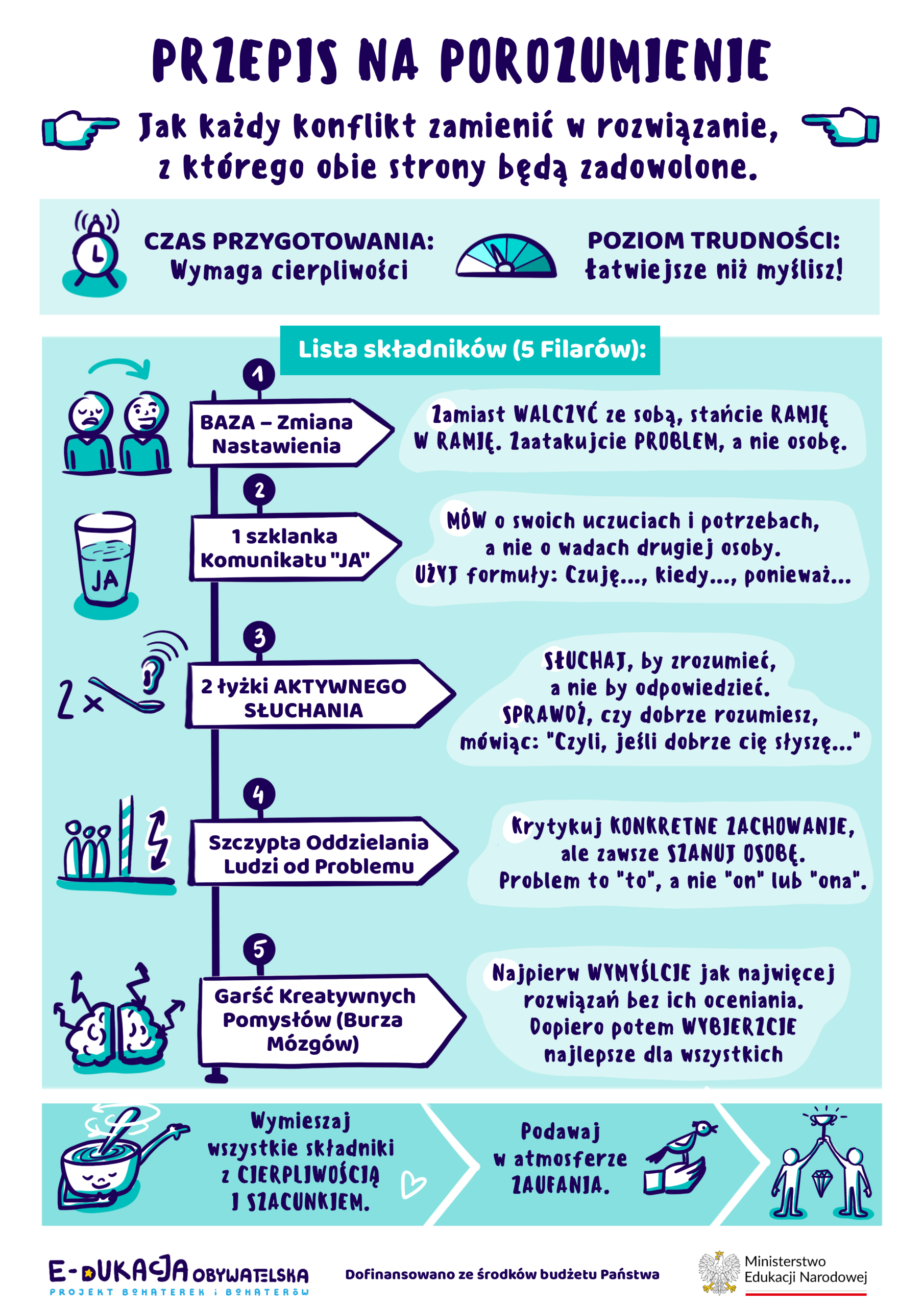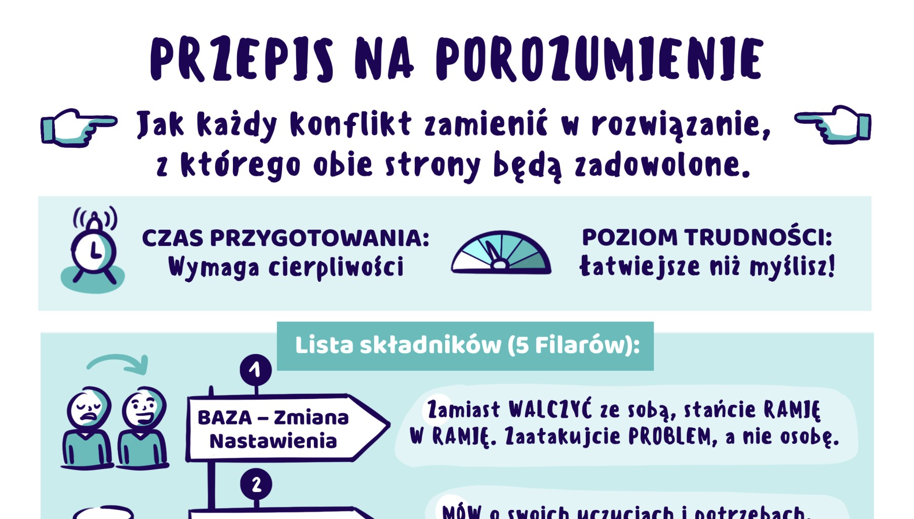 Teoria 5 Filarów: Prezentacja narzędziowa, która uczy, jak w praktyce oddzielić człowieka od problemu i jak szukać „trzeciej drogi” w dyskusji.
