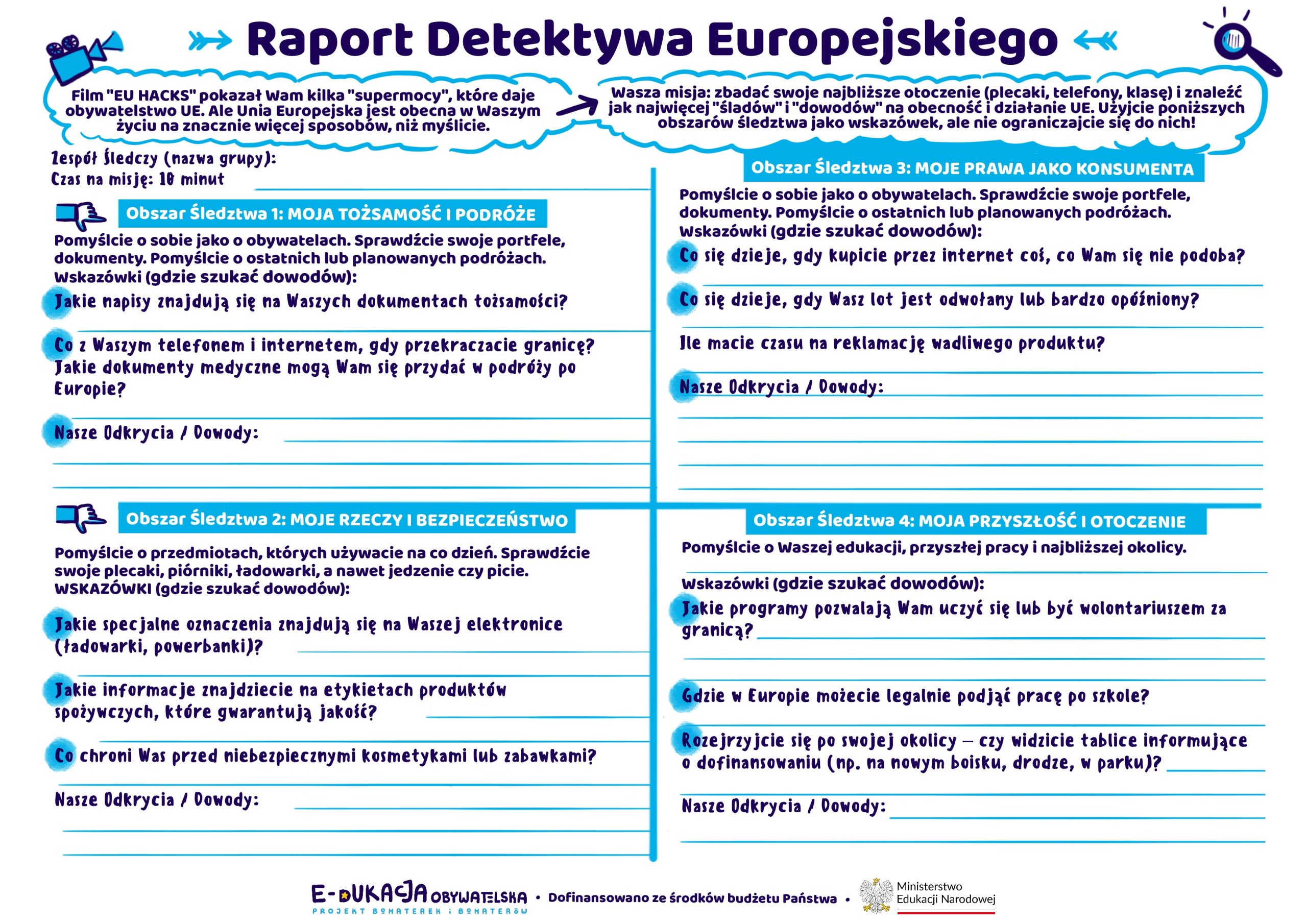 Warsztat „Europejski Detektyw”: Gra terenowa w klasie. Uczniowie pracują z „Raportem Detektywa”, przeszukując swoje rzeczy (telefony, ładowarki, metki), by znaleźć namacalne dowody na działanie unijnego prawa w tej sali.